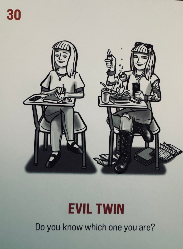 Listen, it might seem like I’m making this up, but it really, truly, without a lie, is what happened: Hug The Crocodile. Every single scene with Jay now has had that card come up.